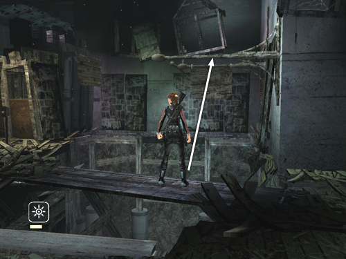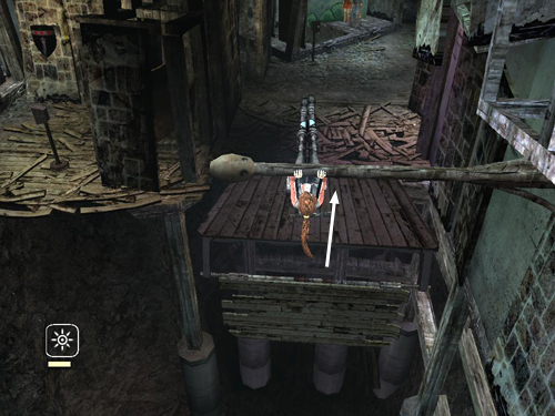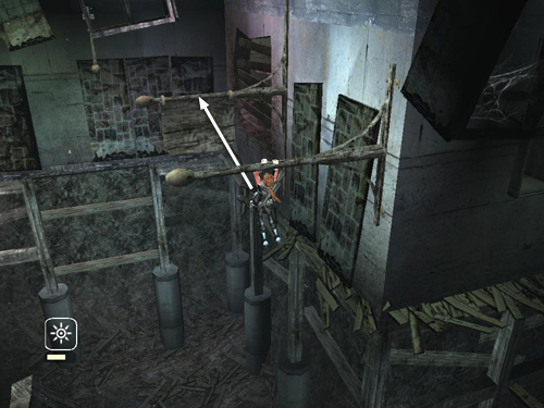 From the horizontal pole on the back wall, swing and jump to grab the top of the wooden door ahead. (It's easy to miss this particular grab and end up hanging by one hand. If that happens, don't forget to press Interact to do a saving grab.)