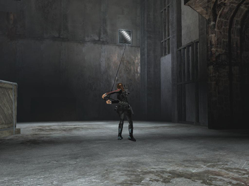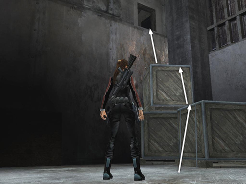 Use the forklift to move one of the stacked crates into the corner beneath the grate. (The main walkthrough covers the forklift controls.) It doesn't need to be positioned too precisely. Now use the forklift to pick up another crate. Maneuver the forklift so the crate it's holding is directly beneath the grate. Raise the fork to its highest position. Then step off.