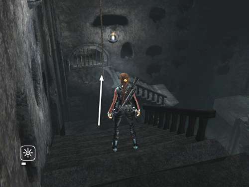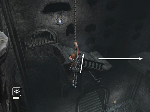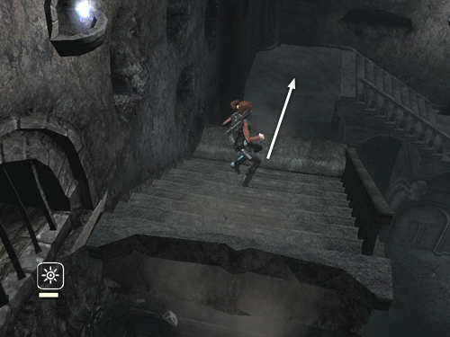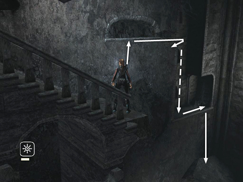 Climb down a bit, adjust Lara's angle, then swing and jump to the broken stairs in the middle of the far wall. The stairs begin to collapse, so quickly turn right and take a running jump to the solid landing in the corner.