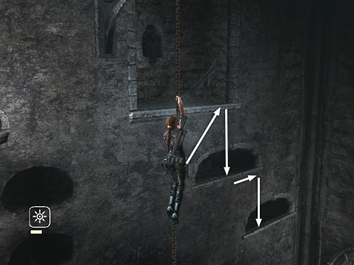 Alternatively, swing from the chain to the alcove on the left wall. Climb to the right and drop to grab the niche below. Climb to the right again and then drop down to the next niche. Note that the sills of these small niches start to break away when Lara grabs them, so you must move quickly.