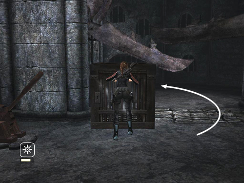 Use either metal box to halt the blades in the doorway on the left (i.e., nearest the lever and on the left when Lara's back is to the open gate).