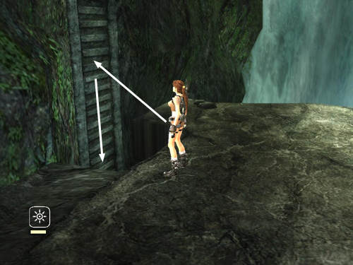 Lara emerges from the trapped hallway on a ledge high above the temple entrance. To the left is a ladder. Jump across the opening in the floor to grab the rungs and climb down.