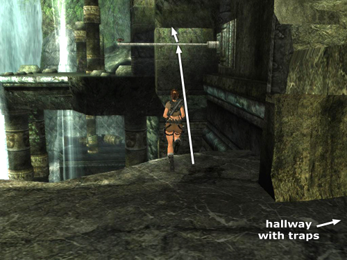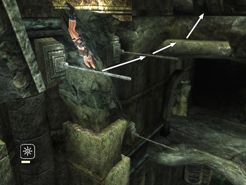 Position Lara facing the horizontal pole next to the exit from the TRAPPED HALLWAY. Jump to grab the pole. Swing around and jump to grab a handhold on the square column ahead.