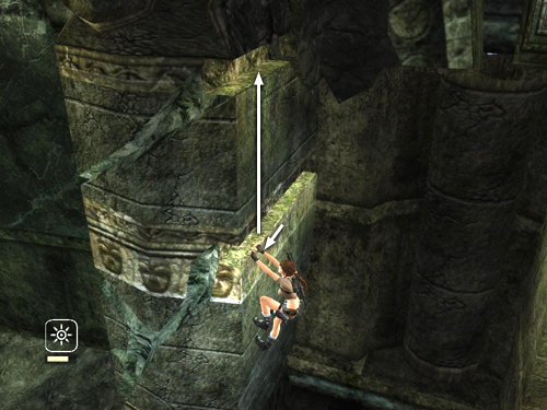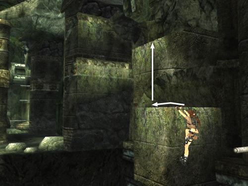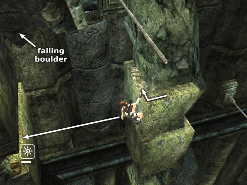 Climb to the left again, just around the next corner. Lean back (left) and jump across the gap to grab a handhold on the next square column. There's a loose boulder directly overhead, but it won't fall until Lara grabs the handhold above.