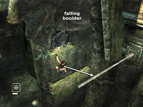 . . . and then immediately jump back to grab the horizontal pole before the boulder falls and crushes Lara.