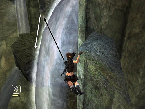 Then return to the handhold above the small step. Climb to the right and jump past the cascade to grab the corner pillar. Continue climbing as described in the main walkthrough.