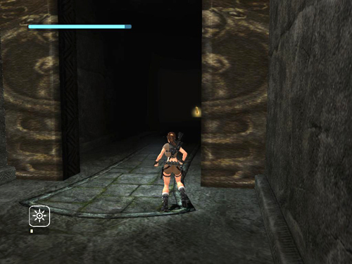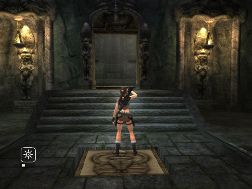 Stand on the pressure pad to open the door ahead, but don't go through yet. This same pad also opens the big doors below. Stand on the pad until the door in front of you has opened fully. Then you'll know the ones down below are also open. Both doors start to close as soon as Lara steps off the pad.