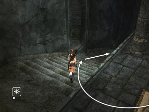 Run up the stairs just a short way to trigger a third boulder. As soon as you hear the rumbling or see the screen start to shake, either run down the stairs into the small alcove (as indicated by the white arrows in the screenshot above), or keep running up the stairs and duck into the alcove ahead on the right (yellow arrow). You could also jump back to the rope, or just run off the edge near the rope. Once the boulder passes, continue up the flight of stairs on the right.