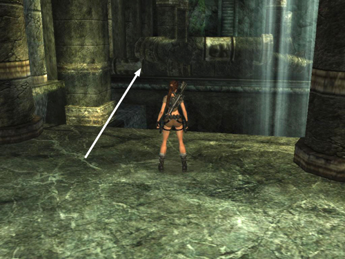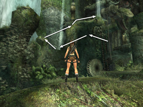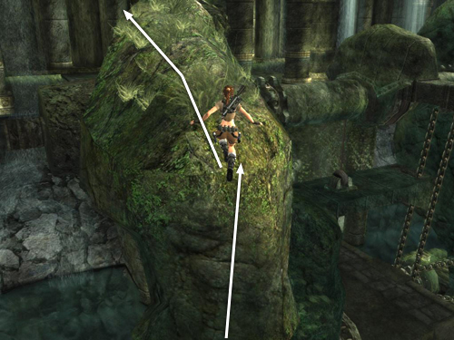 Jump from here to the taller rock formation. Aim for the flat, lighter green area at the middle right, as shown above. Move to the top left side of the taller rock. Again, the actual surface of the rock doesn't match the visual outlines, so until you learn where the edges are, move forward gradually so Lara doesn't fall.