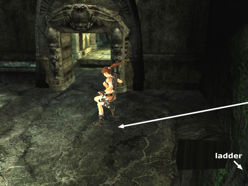 Swing and jump forward to land on an invisible ledge, shown above. Carefully walk to the edge, near the tall rock formation on the right. As long as you inch forward gradually Lara won't fall. If you see her lurch forward, the way she does at a visible edge, stop moving to avoid sliding off. Jump to the flat ledge between the two rounded rock formations.