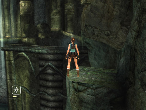 This is the approximate starting position for the jump. Note how the ledge comes to a slight point on the left side. Line Lara up as shown in the screenshot above, so her left foot is at the edge of the ledge, not quite all the way toward the back. Then run forward and jump off between the point and the front corner of the ledge. If you run at just the right angle, Lara will actually take off from a point slightly beyond the edge of the ledge, jump past the boulder without running into it, and grab the ledge beyond. Releasing Forward and continuing to hold Jump after takeoff seems to help, as does not trying to steer to the right in mid-air.