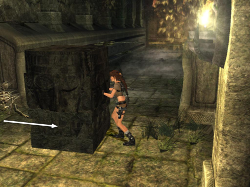 Then push it ahead of Lara through the blades. One way involves pushing the block straight down the center of the passageway (as shown above). Try to keep the block moving straight forward. Don't stop pushing or the blades may knock the block off center, allowing Lara to get sliced.