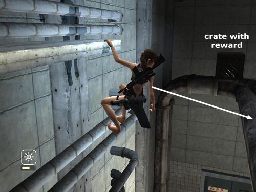 Then jump back onto the pipes behind Lara. Shoot the small crate. . .