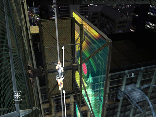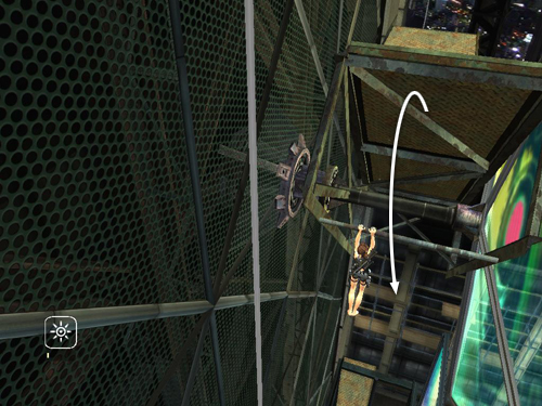 Then when Lara does reach the top, the horizontal bars will be directly behind her, and the camera will be pointing toward them. When Zip shouts a warning over the headset, immediately press Jump, without any direction keys or movement on the control stick, and Lara should jump back. . .
