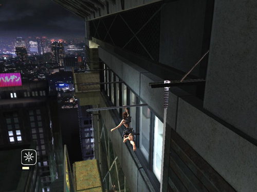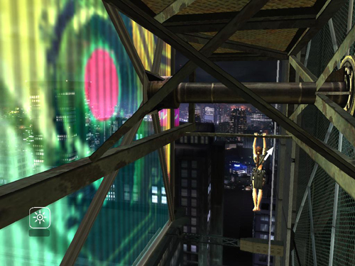 Move to the edge of the ledge and jump to grab the long, skinny vertical pole close to the side of the building. Here Alister begs Lara not to look down. (Bet you did anyway.)