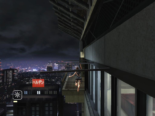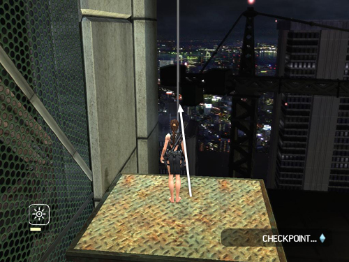 Climb up a bit and jump onto the ledge, which is now horizontal since you turned the sign. Cross the ledge and jump onto the next small ledge ahead, which is CHECKPOINT 14. (Is anybody else wondering what the people down in the street are thinking about all this?)