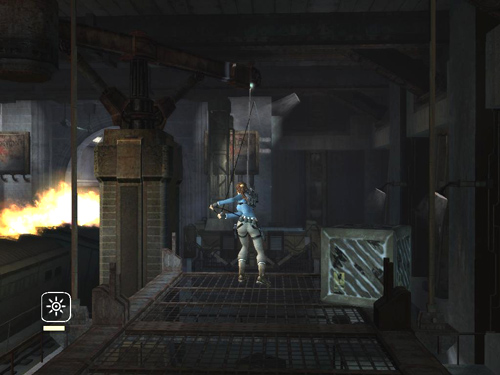 Climb up the rope a little if necessary so Lara doesn't get singed by the flames. Then swing and jump to the next platform.