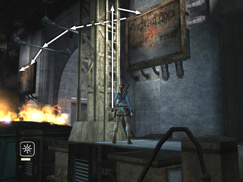 Climb the ladder and jump to grab the top of the sign with the red star. Climb to the left and then jump to grab the horizontal pipe. Swing around the pipe and jump across the flaming wreck to grab the next pipe. Swing and jump to the sign on the wall ahead.