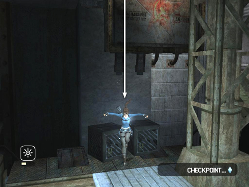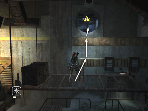 Jump from the platform to grab a handhold on the wall ahead. (If Lara slips, pull the metal box out from under the platform and use it to climb back up.) Jump up to the circular opening and shoot the spinning fan before trying to pass.