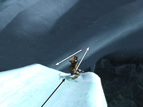 Jump from the end of the trench across the chasm and onto the icy slope ahead, which slants down to the left.