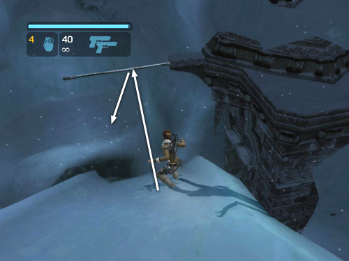 Near the end of the slope, jump to grab another horizontal pole. Before it breaks, quickly swing and jump to the safe, flat ledge below. (Seems like some sturdy nylon rope and crampons would be easier but, hey, it's Lara's call.)