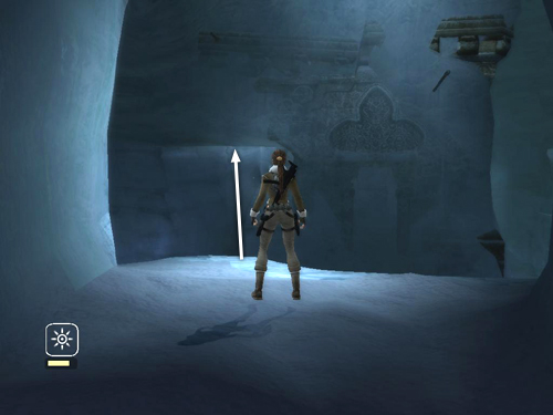 Across the next deep pit you'll see several ledges and poles. The floor on this side juts out a bit on the left side. Jump across the pit there to grab the ice shelf on the other side; pull up. Alister comments briefly on the architecture.