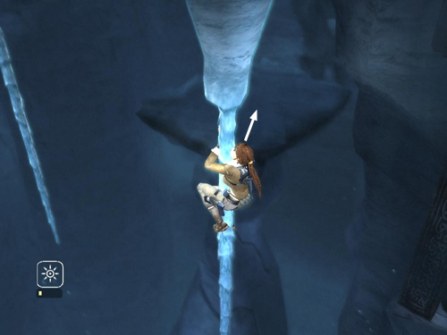 Turn right and jump to grab the horizontal pole. (Don't worry. This one doesn't break.) Swing around and jump to grab the light-colored ice shelf on the wall ahead. Climb to the left.