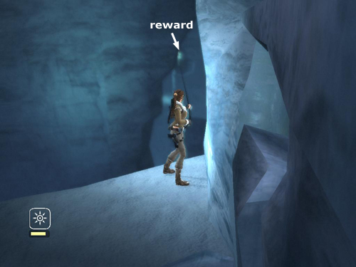 Turn around and then move to the right side of the opening and look to the far wall of the cave, beyond the big icicles and the broken pedestal, to spot a bronze reward (4/9) in a little niche. Use the grapple to retrieve it. If you can't immediately grapple the reward, try using manual aim.