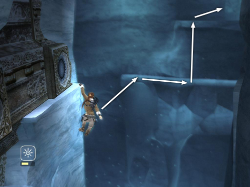 Then leap across the gap to grab a handhold on the wall to the right. (At this point you can drop down to the ledge below, but it's not necessary.)