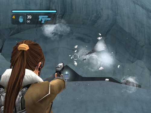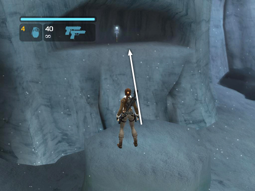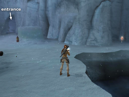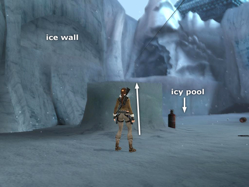 Locate the arched wall of ice high on the wall above and to the left of the icy pool. (The binoculars in RAD mode show where this breakable wall is in case you can't spot it.) Climb onto the little plateau of snow near it.