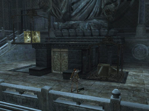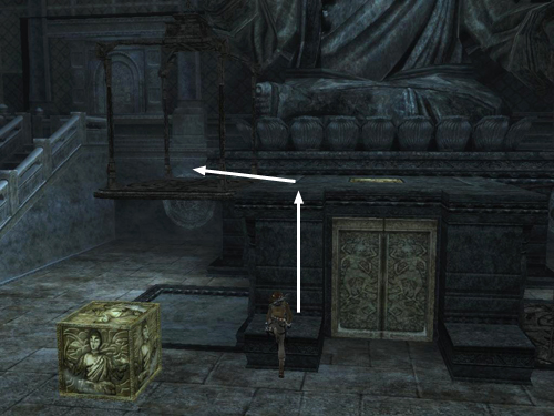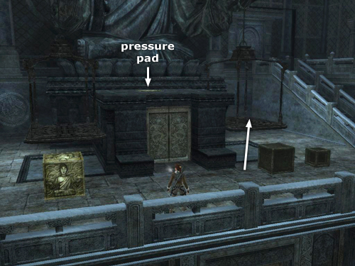 First, face the statue and climb onto the scale platform on the right, as indicated by the arrow in the screenshot above.