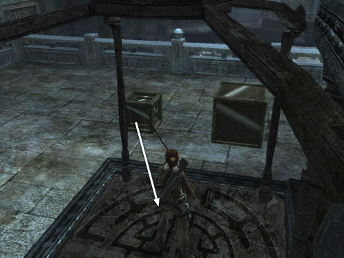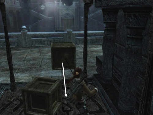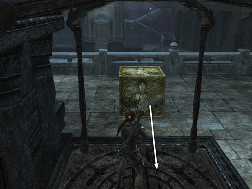 LGo around to the front of the ledge and climb up near the pressure pad. Then step onto the empty left platform. Lara's weight pushes it down.