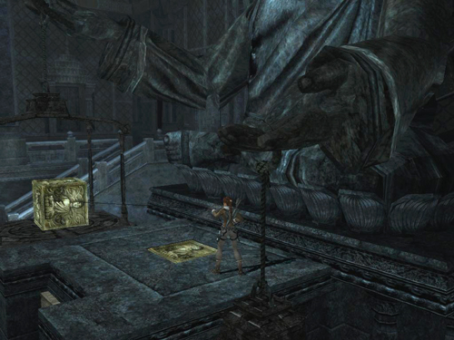 To open the door at the base of the statue, you need to get the golden block up onto the golden pressure pad on the ledge using the scales hanging from the Buddha's hands, along with the medium and small blocks and Lara, herself, as counterweights.