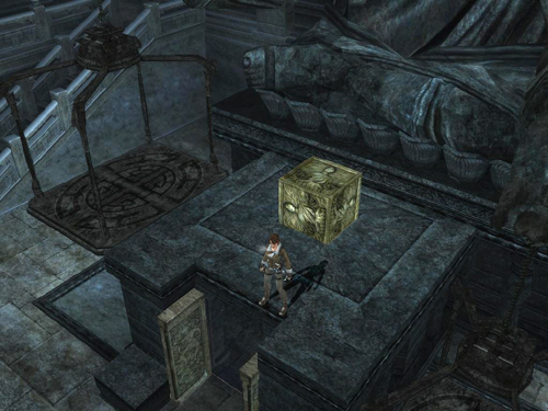 The combined weight of Lara and the small block lowers the platform to the floor. Grapple and pull the medium block onto the platform. The medium and small blocks together are heavier than the golden block.