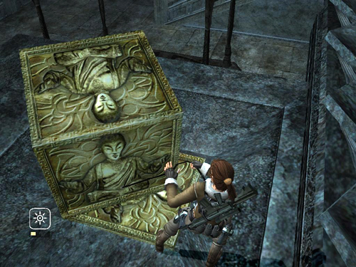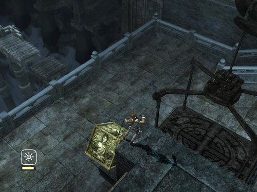 Instead of going through the elaborate process of solving the balance puzzle, as shown in the previous set of screenshots, Lara can grapple the golden block up onto the ledge. This takes a little finesse, but if you practice it first, it can save precious seconds during a time trial.