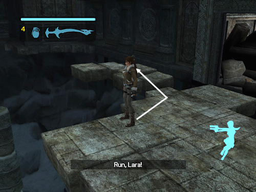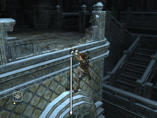 Once you've made it to this ledge, you can take your time. The remaining ledges are solid. Position Lara as shown in the screenshot above and take a running jump to the small, uneven ledge in the corner. You're aiming for the point indicated by the arrow, which juts out a bit farther than the rest of the ledge.