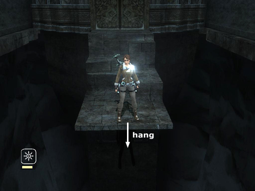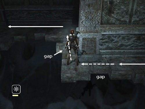 After landing on the corner ledge, go to the left. Watch out for the gap in the floor (indicated in the screenshot above). If you move quickly and stay near the wall, you can cross over it without falling. Or, jump over the gap but take care not to overshoot the ledge ahead. Then turn right and jump across another gap in the floor. After you've cleared the second gap, go forward toward the wall and then turn left and follow the balcony to the end.