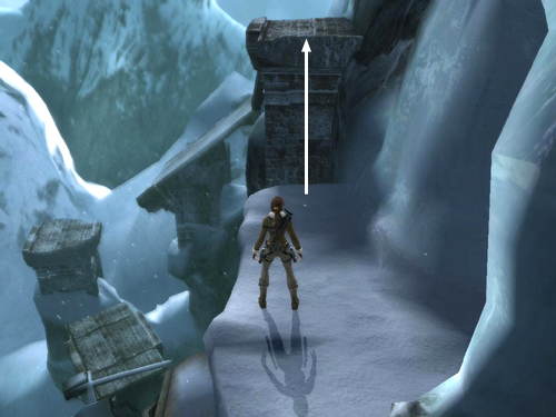 Just beyond the ice tunnel and CHECKPOINT 3, turn right and jump across the gap to grab the top of the stone pillar. Pull up.