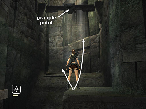 Once Lara is standing on that ledge, turn to face the top of the slope, jump off the ledge and immediately press Jump again to snag the metal grapple point above. Then either swing to the flat spot at the top of the slope and climb onto the ledge on the right, or shorten the cable and swing directly to that ledge. Note that Lara can't climb up on the left side of the ledge where it has crumbled, only on the right where it's intact.