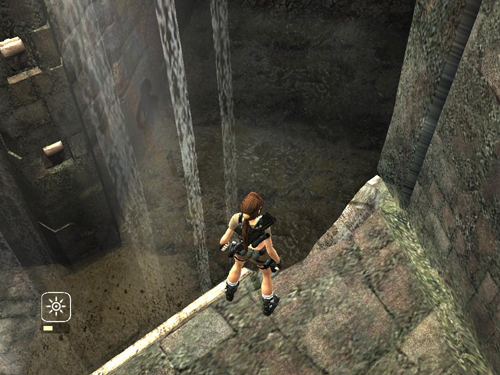 The slope here is too steep to climb. So climb the carved stone handholds on the left and jump back to grab the ledge behind. Pull up.
