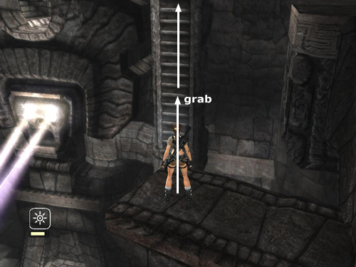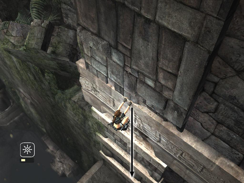 Turn around and position Lara at the squared-off corner of the ledge, facing the dangling vine. Then jump forward to grab it.