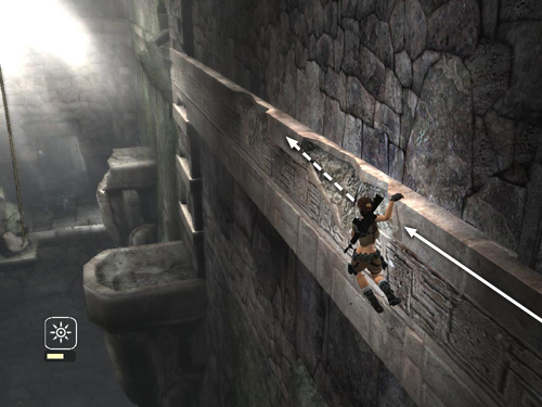 Continue to the left, above the huge pit. When you come to the first broken section of the handhold, hold the left direction key (or left on the control stick). You'll see Lara lean to the left and begin to lunge forward and pull back as though getting ready to jump. If you jump just as she lunges to the left, she should grab the shelf on the other side without the need for a saving grab.