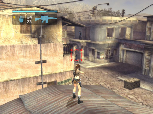 If Lara falls off the roof, you could use the drainpipe on the building where the first sniper was standing (shown in the fourth and fifth screenshots above) to climb back up. However, if there are still men on the opposite roof, they can hit her as she climbs. You're probably better off on the ground using the buildings for cover. [Return to the Peru Walkthrough] Copyright © 2006- - Stellalune (). All rights reserved. The screenshots and videos included here were made using Fraps. Feel free to copy or print this walkthrough for personal use. By all means, share it with friends, but please include this credit line so people can send me their feedback. No part of this walkthrough may be reproduced on another site without permission. Follow this link for details about this site's advertising and privacy policy. |