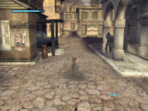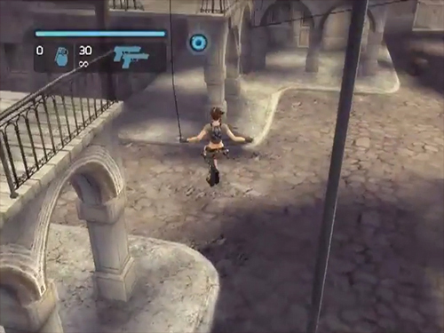NOTE: You can save a few seconds by jumping directly from the flagpole to grapple the lamp on top of the pole. Then swing and jump over to the second balcony. You can then run/roll past the guy with the shotgun and through the building. Don't waste time fighting him. –Stella