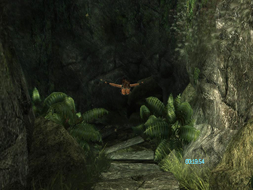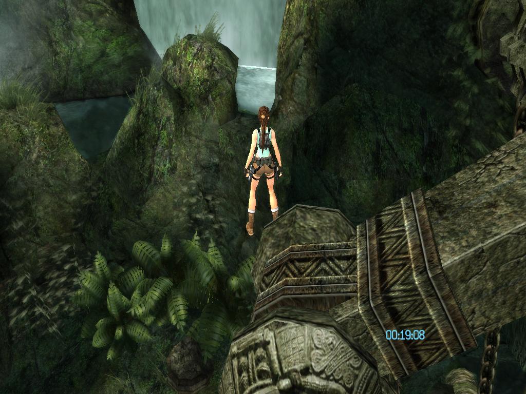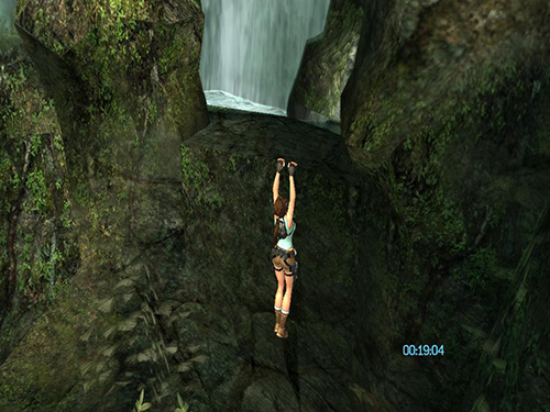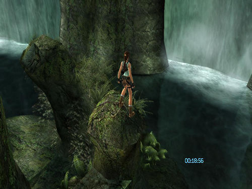 Once Lara is on top of the rounded rock, turn around to face the taller rock formation. Very carefully inch forward and to the right until Lara is standing on the tallest part of the rounded rock. This is actually an invisible protrusion above the rock.