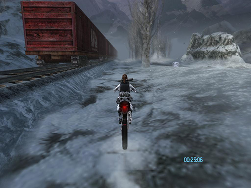 As soon as the train starts to moving roll past the other enemies to reach bike. Again, ignore the two guys here. Lara has no time for them. Just get on the bike and go.