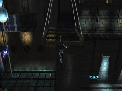 OK, the fun with the bike is over. Now it is time to get back to business. Kick away the crate, grapple the crane arm, and jump to the rope. Then, instead of climbing all the way around the room, turn Lara 45 degrees to her left. Get her swinging high and jump her over the burning wreck. She will take a little damage, but you'll save precious seconds. Climb onto the platform, grapple the crane arm, jump to the rope and continue as usual.