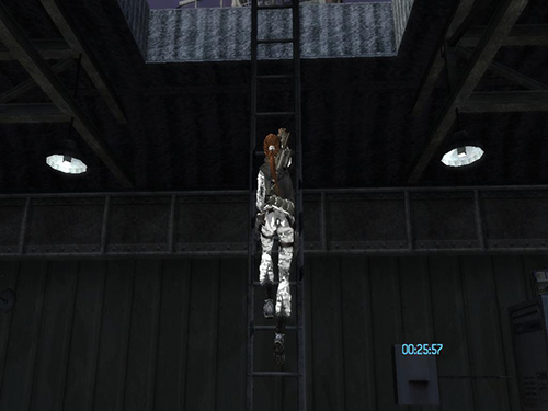 Now roll through this area until you reach the ladders. The enemies will shoot at you, but you won't take too much damage if you keep moving.