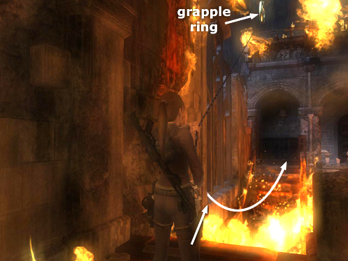 Turn left and go to the end of the balcony. Then turn right to face out over the flaming staircase. Position the camera behind Lara so you can see the metal ring on the ceiling above. Press the Grapple key to fire the grapple, anchoring it to the ring (as shown in this screenshot). Run and jump off the edge and Lara will swing across the flames. If she has enough momentum, just press Jump as she nears the far balcony and she'll detach the cable and land there. Otherwise, keep the camera pointing forward and press and hold the Forward direction key (or push the left stick forward if you're using a gamepad or controller) to swing back and forth. When you've built up enough momentum, wait for Lara to swing toward the far balcony and then press Jump to land there.
