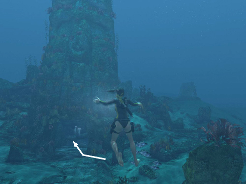 SUBMERGED RUINS: Jump off the back of the boat and swim downward toward the ruins below. Lara automatically equips her scuba gear. As you explore, you'll encounter 3 or 4 sharks. They won't all attack at once, but you should keep an eye out for danger. If you want to, you can swim around the open water a bit to locate and kill them before you turn your attention to the ruins.